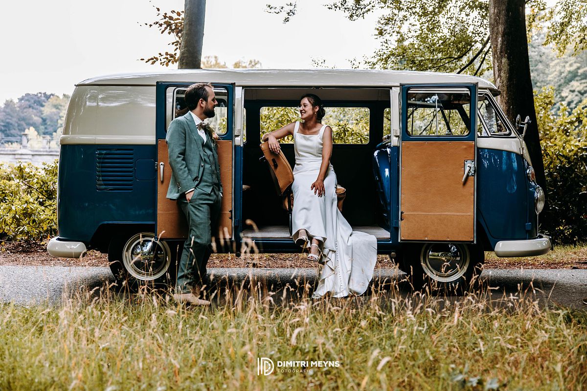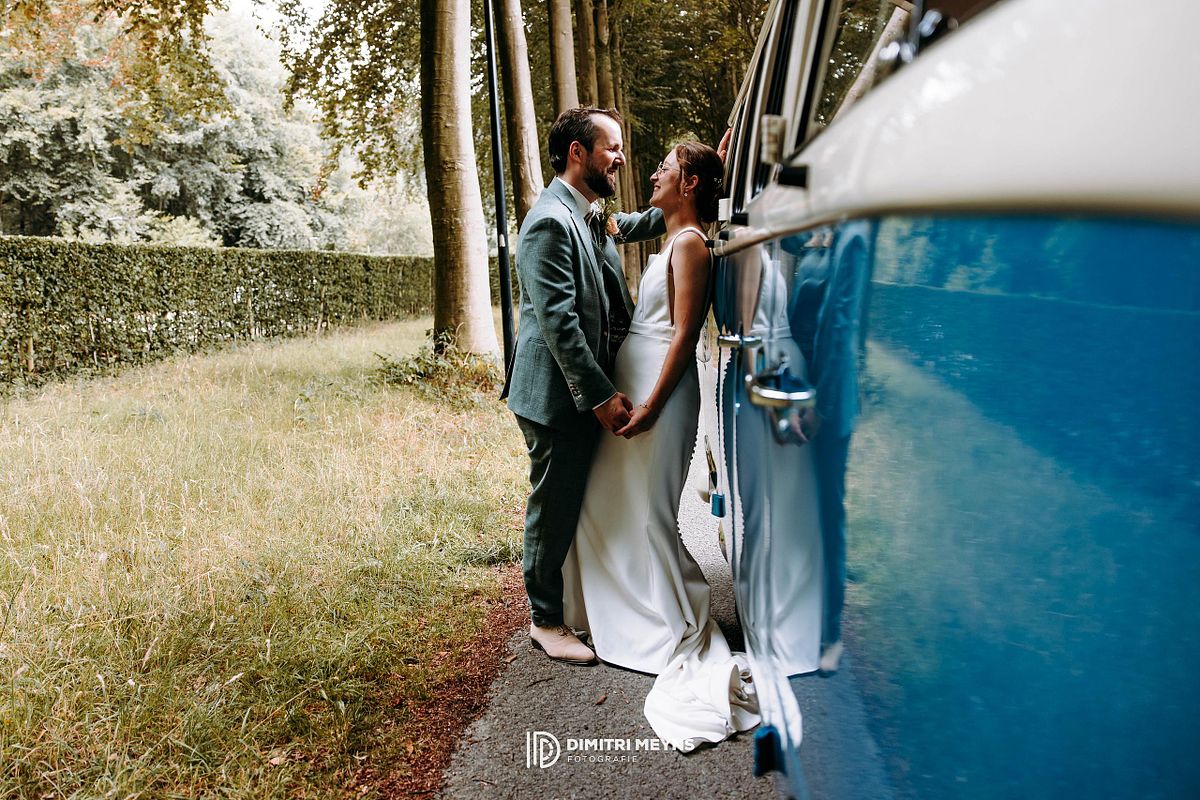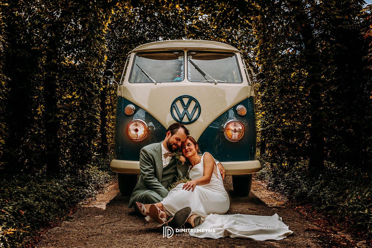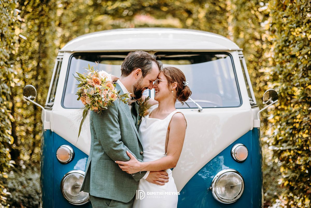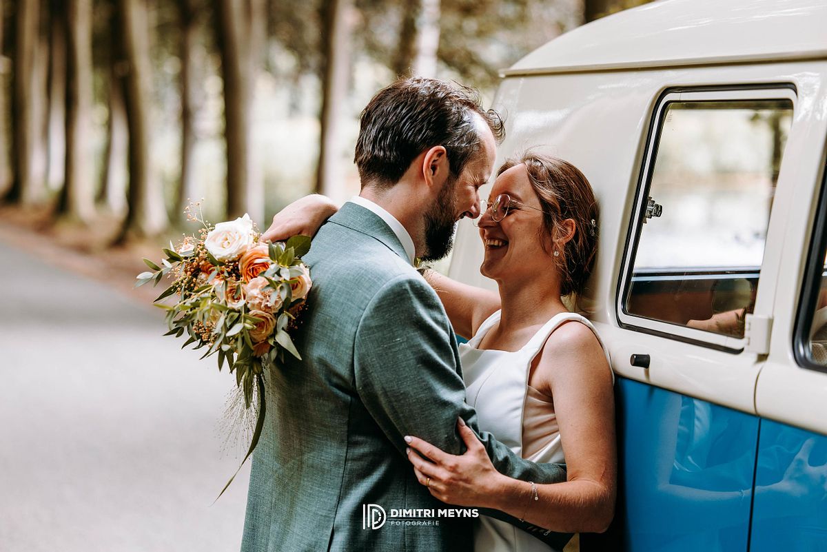 Na de ceremonie wachtte het charmant Volkswagen busje van mijn trouwbusje hen op, klaar om het koppel terug naar huis te brengen voor een ontspannen lunch. Dit rustmomentje was de perfecte opwarmer voor het volgende hoofdstuk van hun dag: een romantische fotoshoot in het schilderachtige Tillegem kasteel. Tussen de statige bomen en oude muren straalden Yana en Olivier van geluk – het was alsof het kasteel speciaal voor hen was opgebouwd.