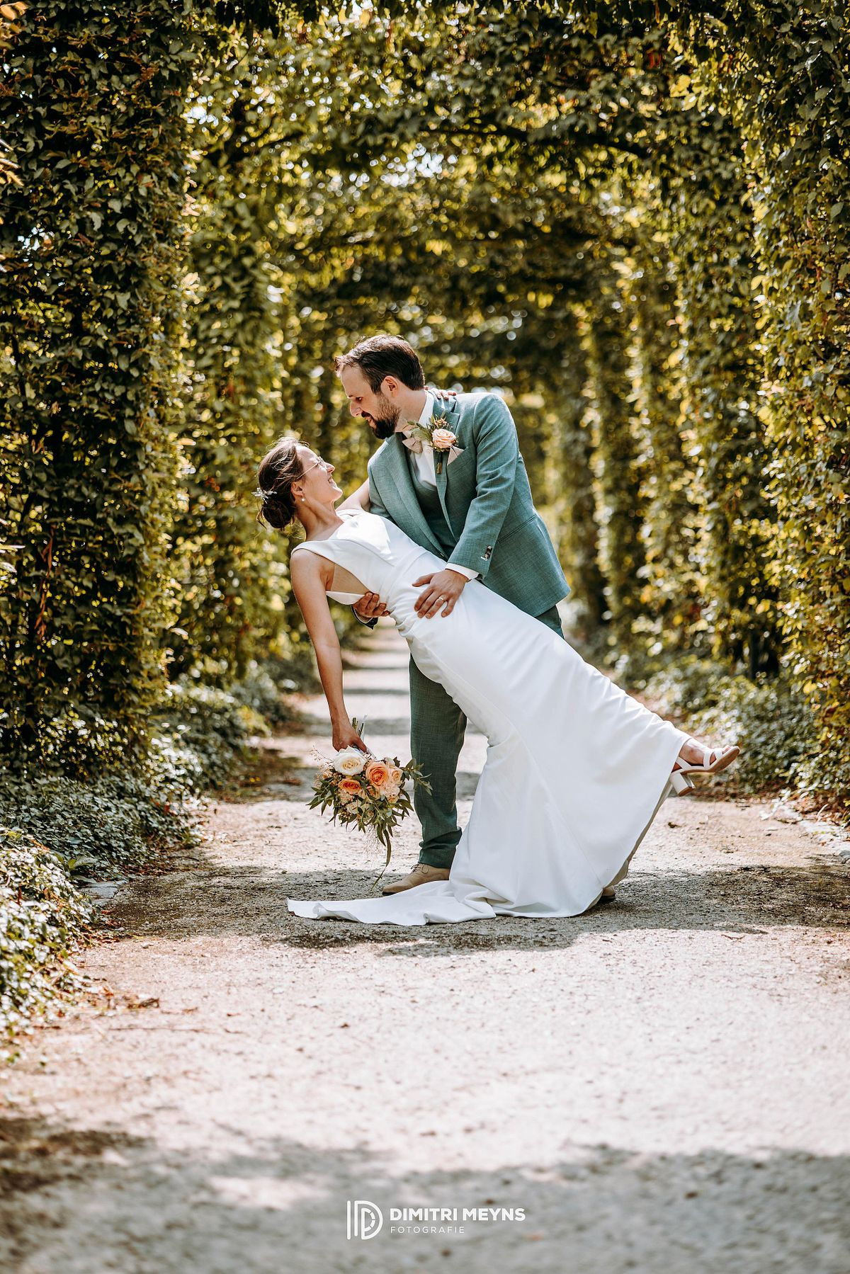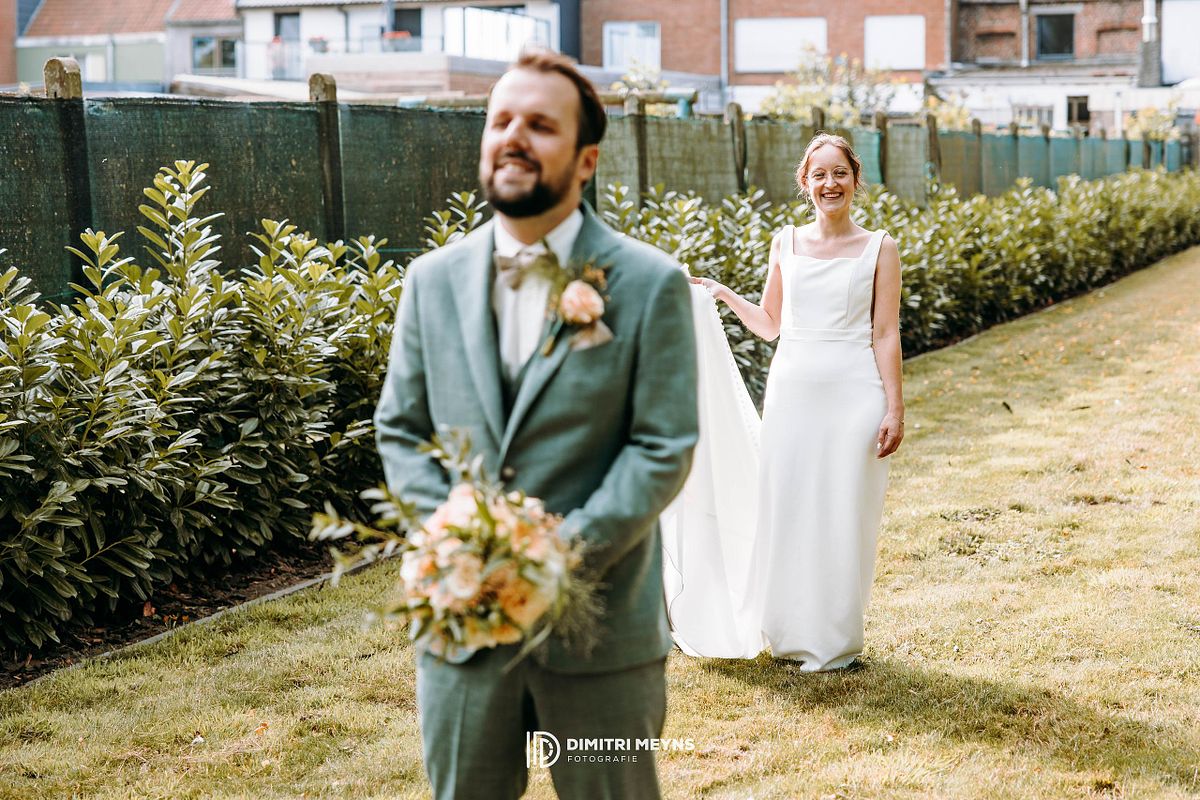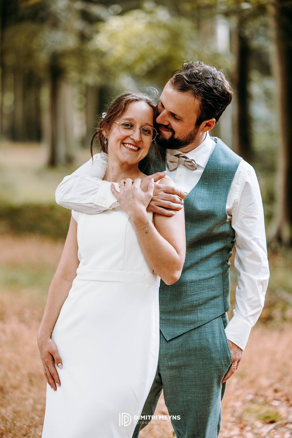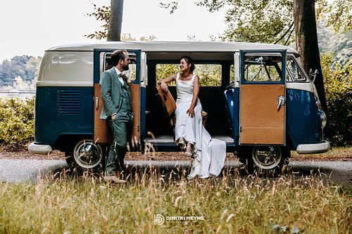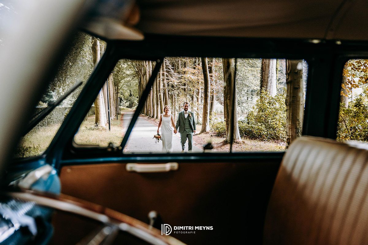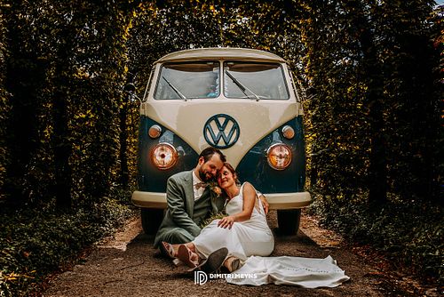 Na de ceremonie wachtte het charmant Volkswagen busje van mijn trouwbusje hen op, klaar om het koppel terug naar huis te brengen voor een ontspannen lunch. Dit rustmomentje was de perfecte opwarmer voor het volgende hoofdstuk van hun dag: een romantische fotoshoot in het schilderachtige Tillegem kasteel. Tussen de statige bomen en oude muren straalden Yana en Olivier van geluk – het was alsof het kasteel speciaal voor hen was opgebouwd.