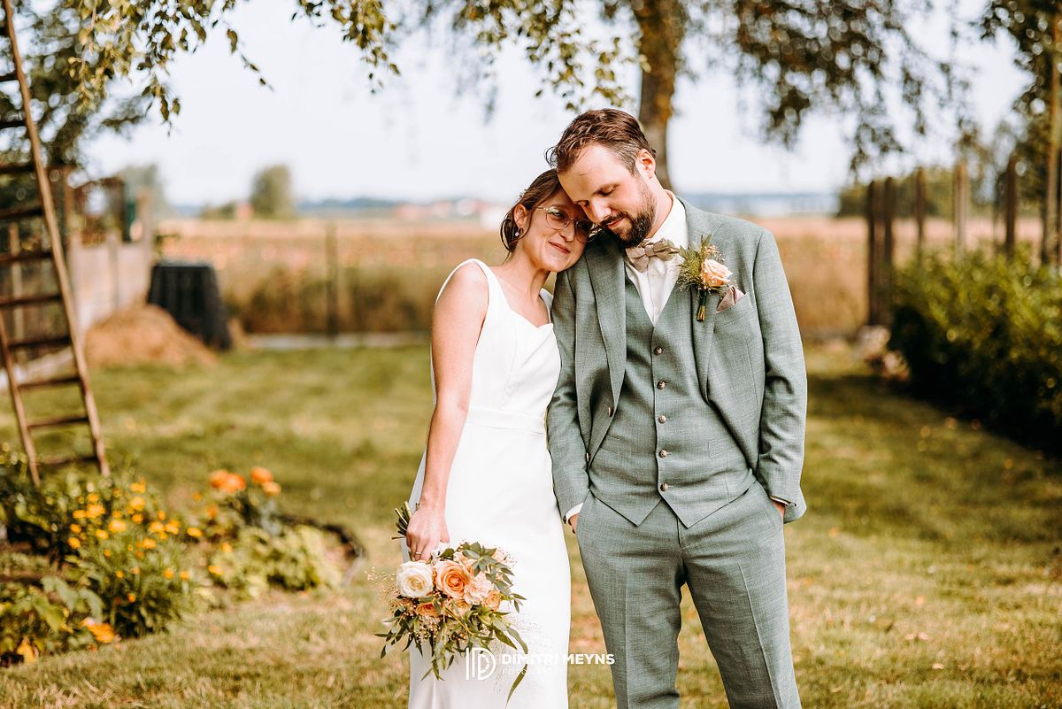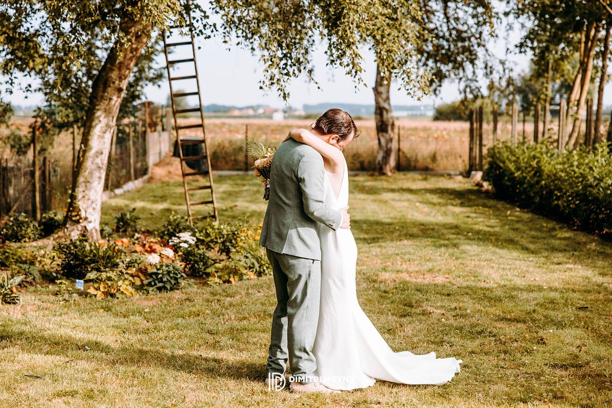 De dag ging verder in stijl toen het busje hen naar de prachtige feestlocatie Hoeve Schellevliet in Zuienkerke bracht. Daar vond eerst een sfeervolle ceremonie verzorgt door trouwburo Karo plaats onder de zomerzon, gevolgd door een gezellige receptie waar gelach, klinkende glazen en warme knuffels centraal stonden.