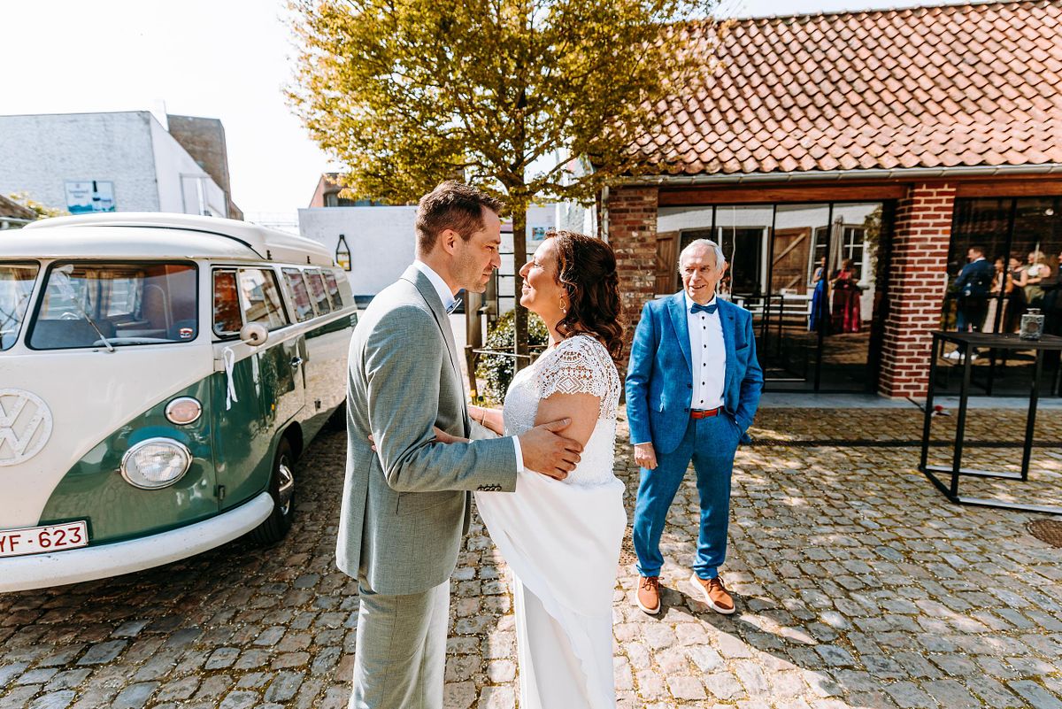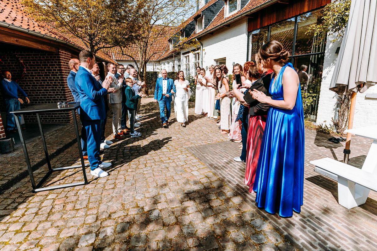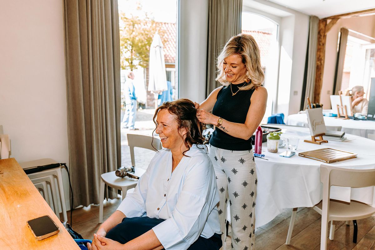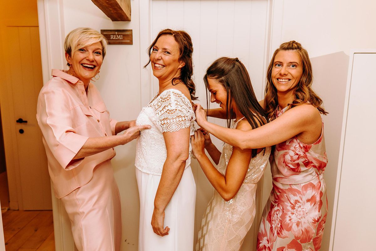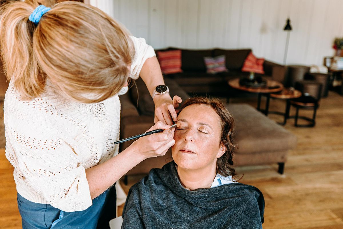 De dag begon in alle rust in het Douviehuis. Geen haast, geen spanning die overneemt — gewoon samen met familie, dicht bij elkaar. Terwijl de voorbereidingen zachtjes op gang kwamen, zorgde Instituut Hilde Declerck voor de make-up. Alles klopte, zonder dat het geforceerd voelde.