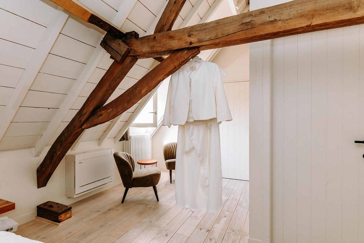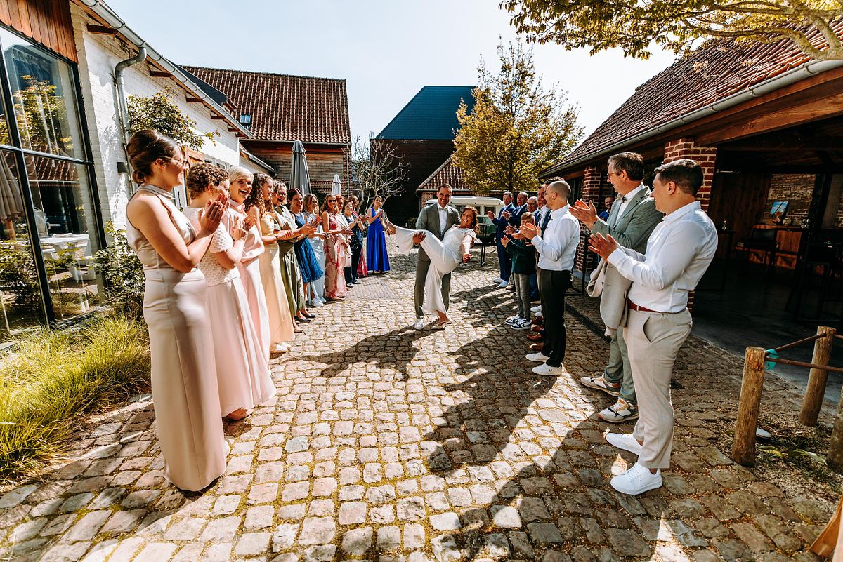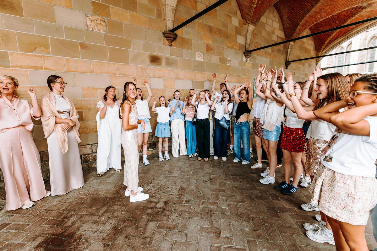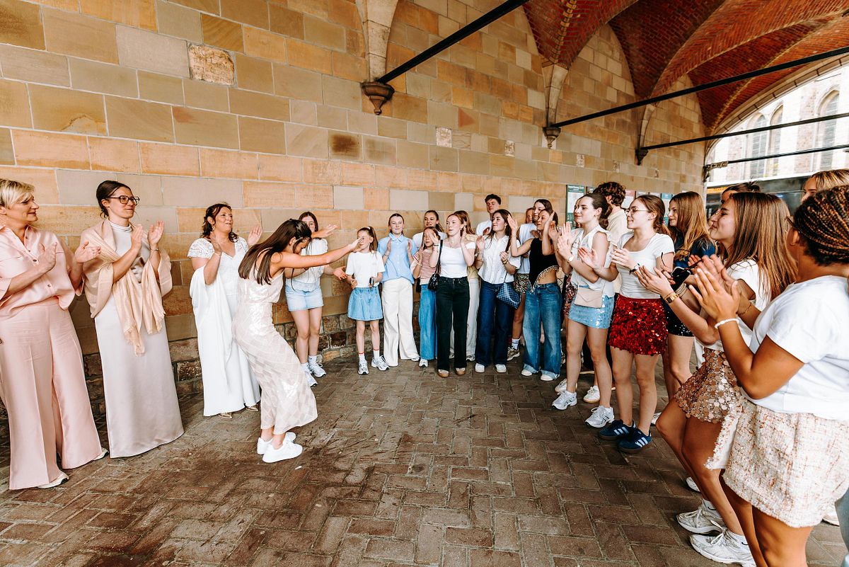 De dag begon in alle rust in het Douviehuis. Geen haast, geen spanning die overneemt — gewoon samen met familie, dicht bij elkaar. Terwijl de voorbereidingen zachtjes op gang kwamen, zorgde Instituut Hilde Declerck voor de make-up. Alles klopte, zonder dat het geforceerd voelde.