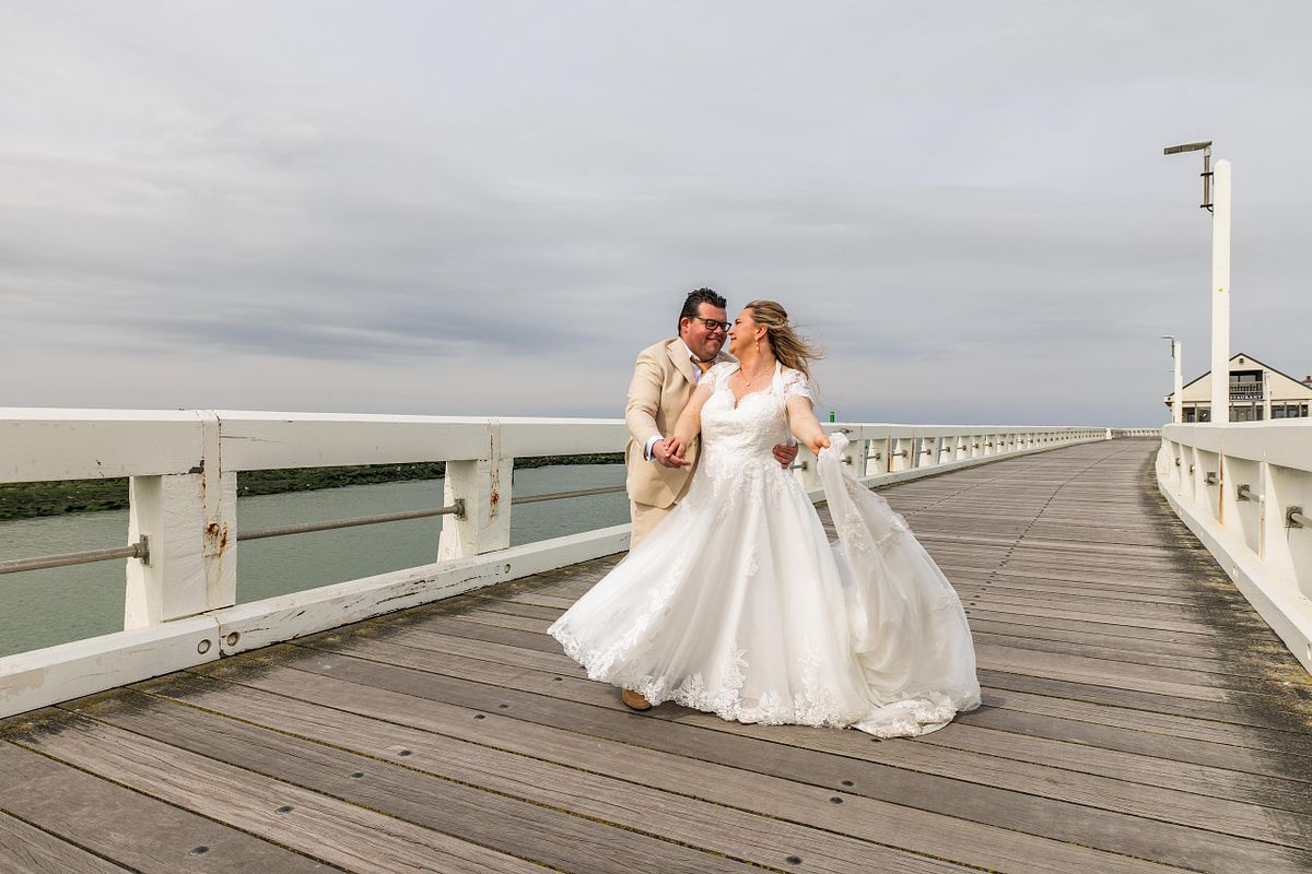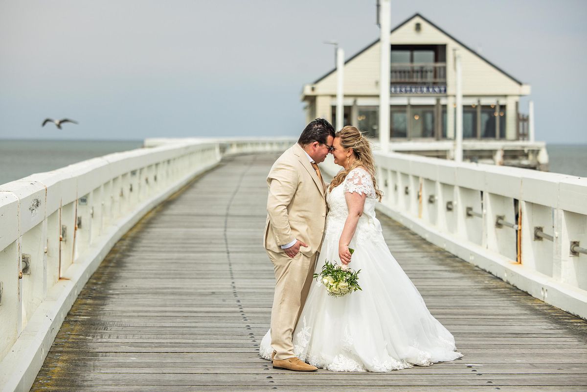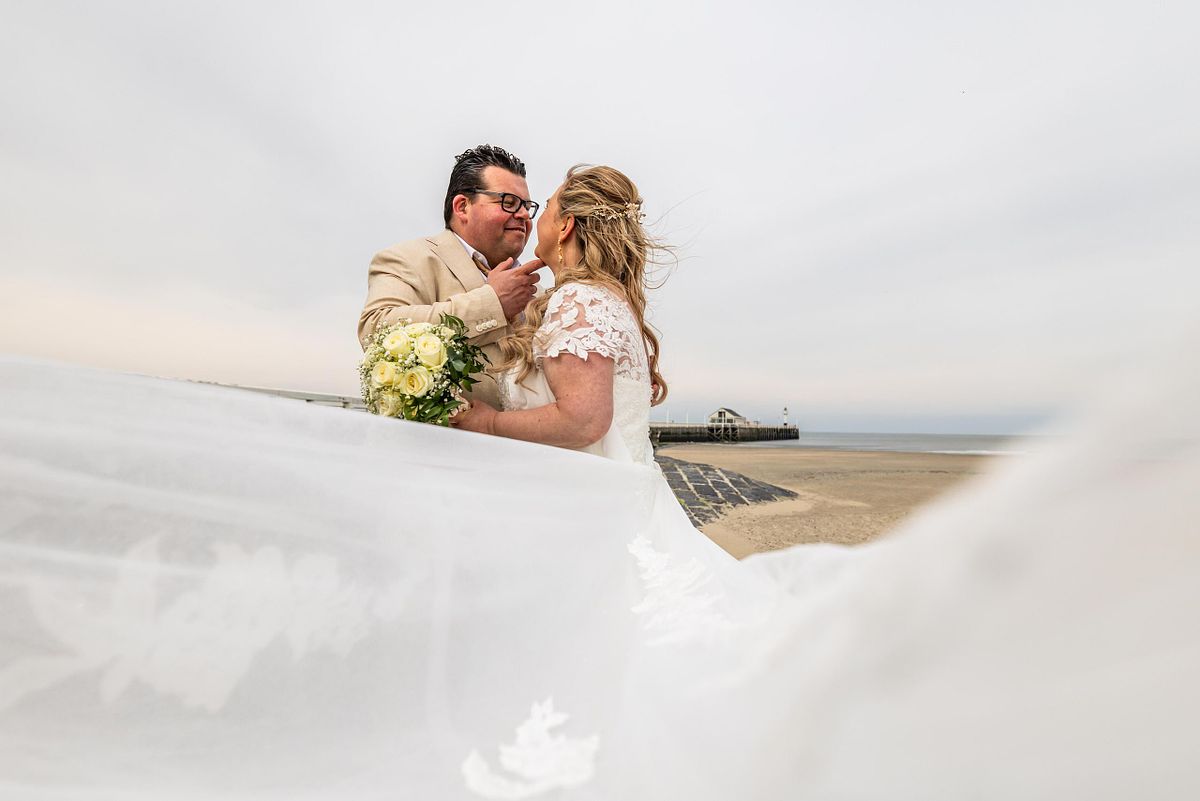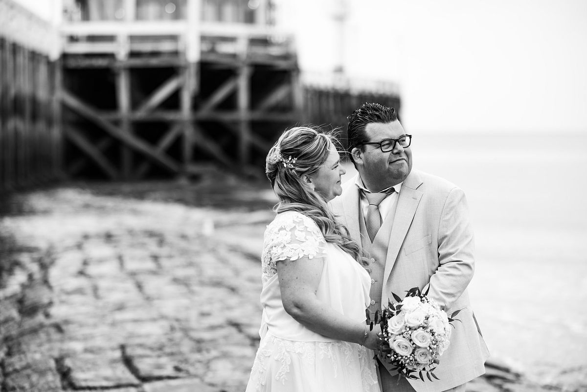 Hun first look gebeurde op de dijk. De zee op de achtergrond, de wind die zachtjes meespeelde. Zo’n moment waar alles even stilvalt. Waar de rest van de wereld er niet toe doet. Gewoon zij twee.
