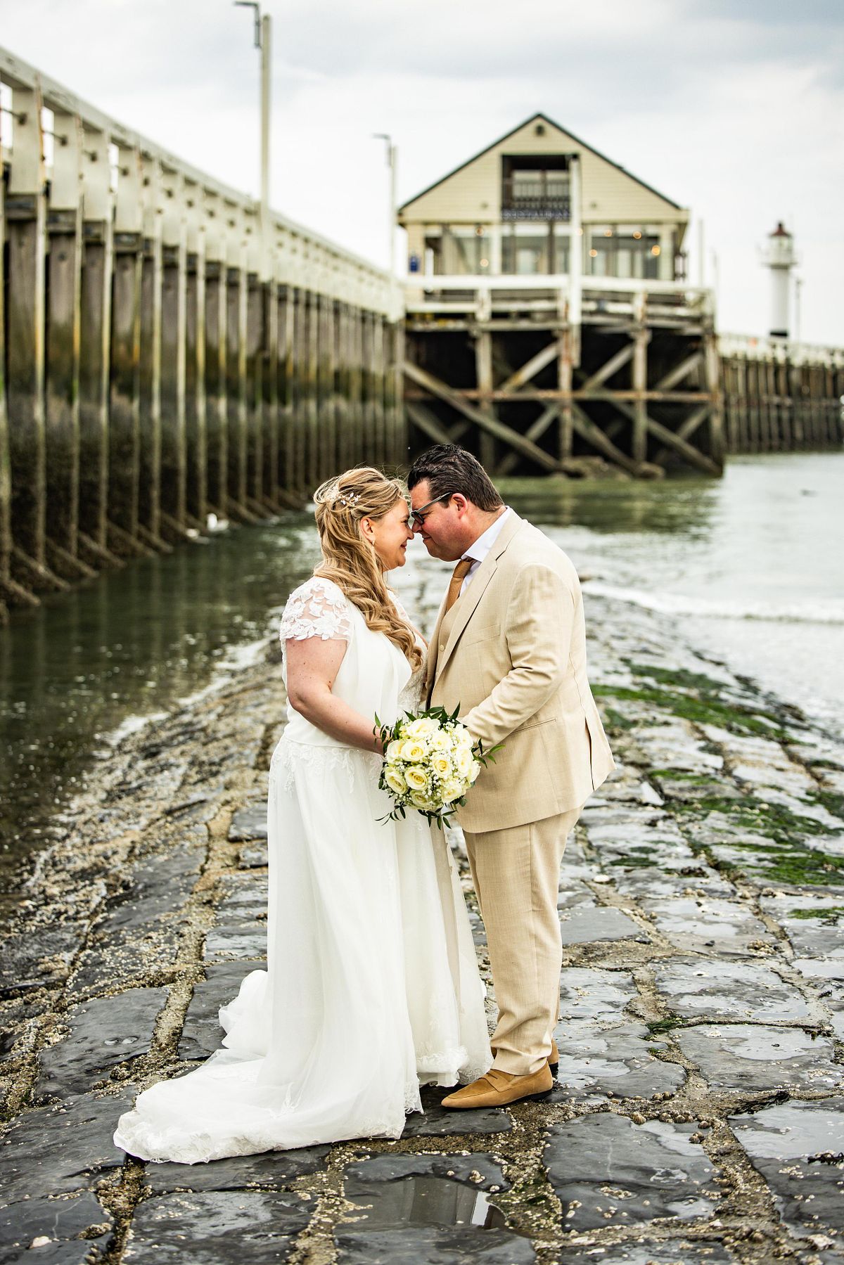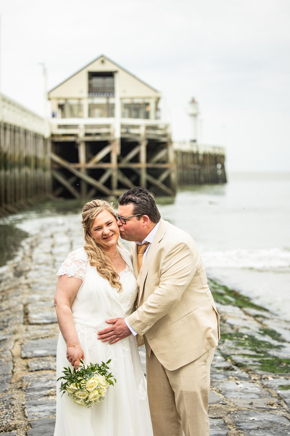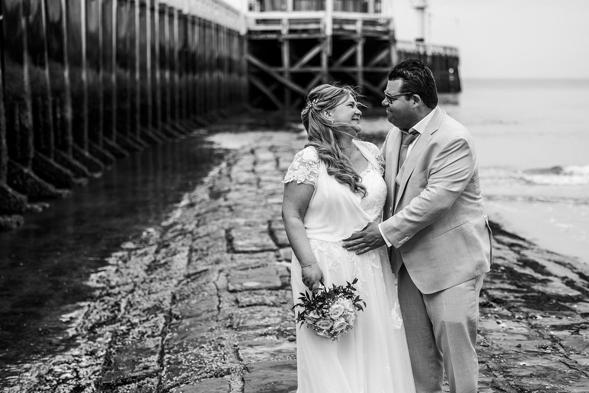 Hun first look gebeurde op de dijk. De zee op de achtergrond, de wind die zachtjes meespeelde. Zo’n moment waar alles even stilvalt. Waar de rest van de wereld er niet toe doet. Gewoon zij twee.