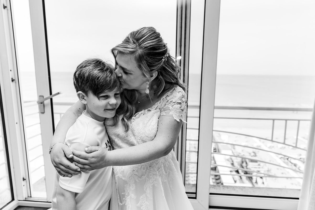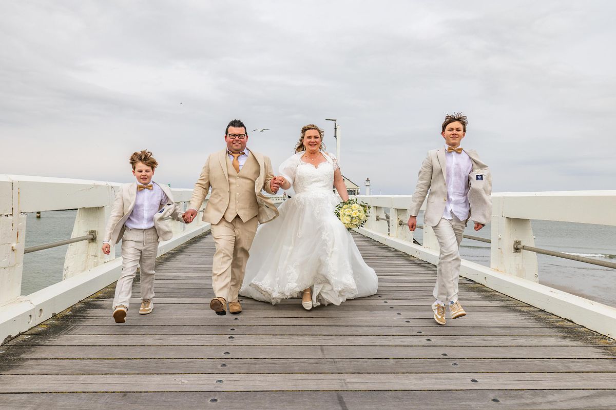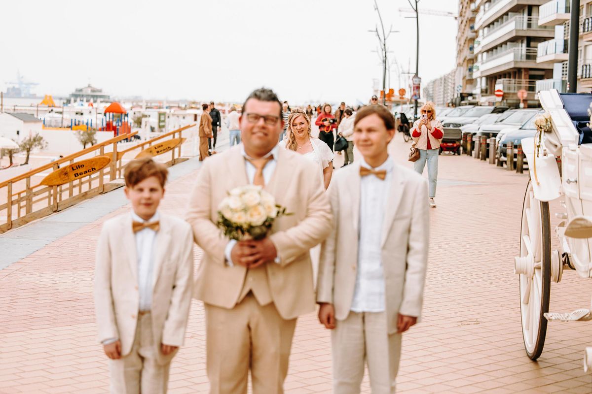 Voor de fotoshoot werden Cindy en Kim opgehaald met een koets getrokken door twee paarden. Iets wat meteen een extra laag gaf aan de dag — een tikje dromerig, een tikje nostalgisch. Die bracht hen naar het strand, waar we samen foto’s maakten. Niet alleen van hen twee, maar ook met hun zonen, Siebe en Joran. En net dat maakte het compleet. Geen geposeerde perfectie, maar echte momenten. Lachen, lopen, dicht bij elkaar zijn.
