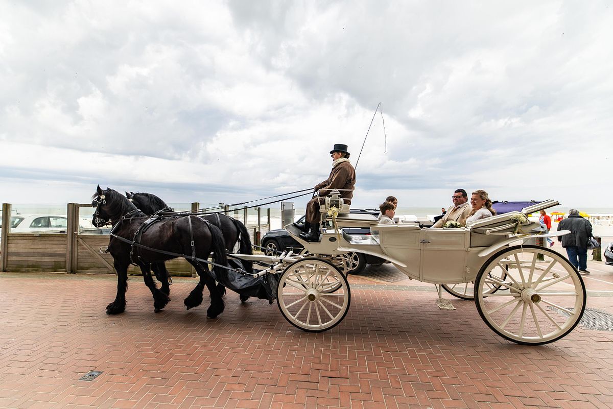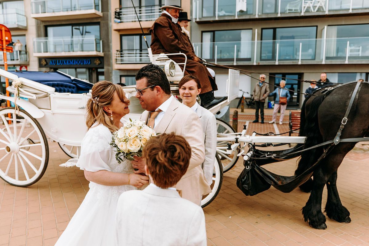 Na de shoot stond er een tweede koets klaar. Groter deze keer, om ook de dichte familie mee te nemen richting De Pier in Blankenberge. Een mooi, verbindend moment. Samen onderweg naar het volgende hoofdstuk van de dag.